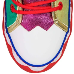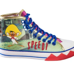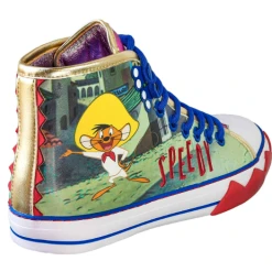 Show your love for the fastest mouse in Mexico with these super cool lace up trainers! A classic sneaker silhouette is embellished with adorable prints of Speedy Gonzalez with embroidery of his name to match. The mismatched laces echo the blue and red detailing on the sole, which are then accented by the striking gold trim and metallic pink tongue. Pop them on and feel like the rapid rodent you are!